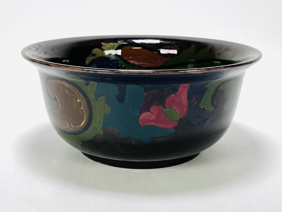 Een ronde aardewerk kom uit de Art Nouveau periode (circa 1900–1920), vervaardigd in Plateelfabriek Zuid-Holland Gouda. De kom is handbeschilderd in een polychroom floraal decor met glansglazuur op een donkerblauwe tot zwarte ondergrond. De onderzijde merkteken "Gouda v. Holland" en modelnummer.