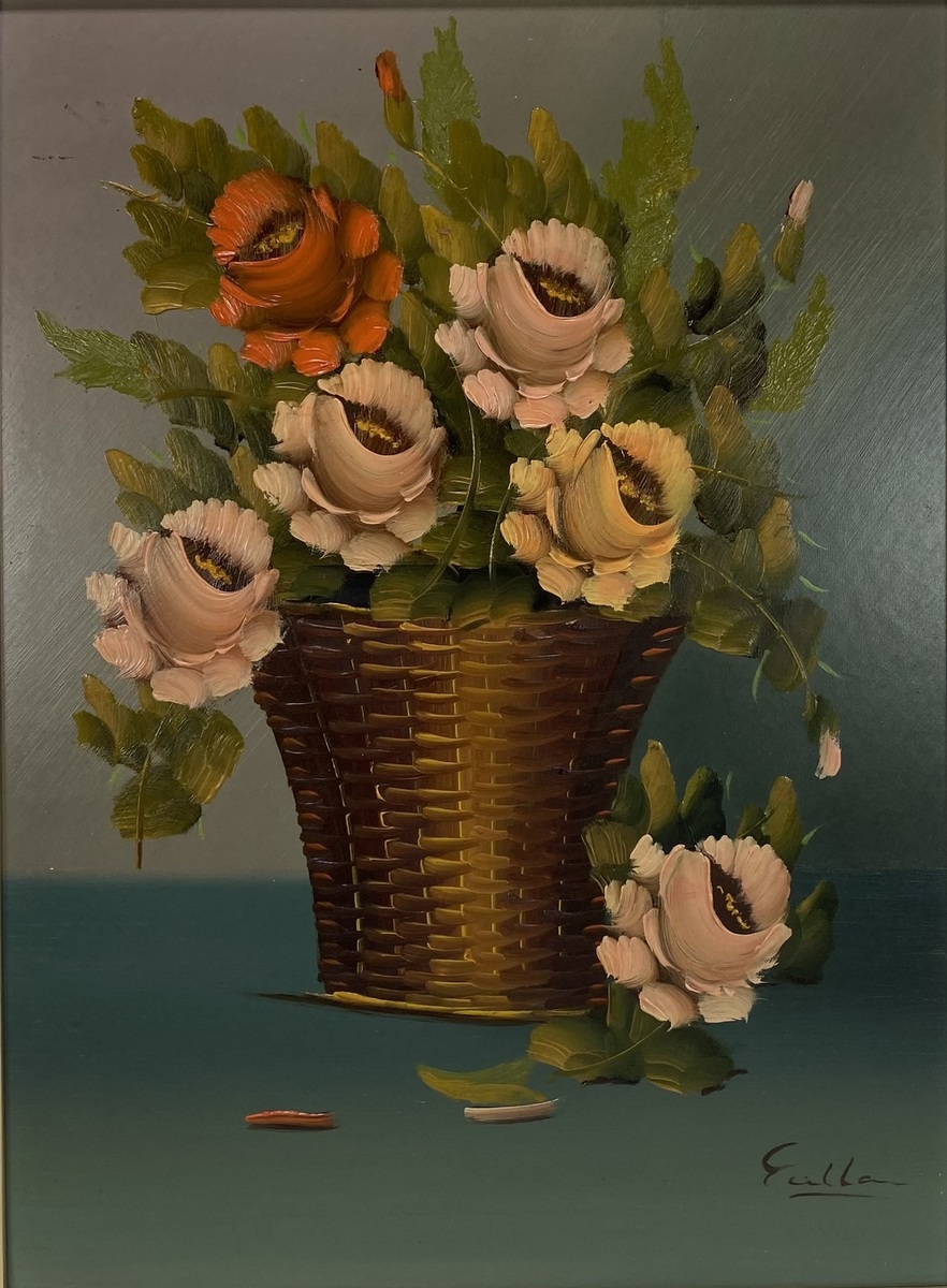 Figuratief schilderij door de Nederlandse kunstenaar Adriaan Gallen (1938), olieverf op hardboard, rechtsonder gesigneerd 'Gallen'. Het stilleven uit het midden van de 20e eeuw toont een weelderige bos bloemen in zachte, roze en oranje tinten in een gevlochten mand tegen een groenblauwe achtergrond. Het werk is in een realistische, pasteuze stijl uitgevoerd en voorzien van een goudkleurige lijst.