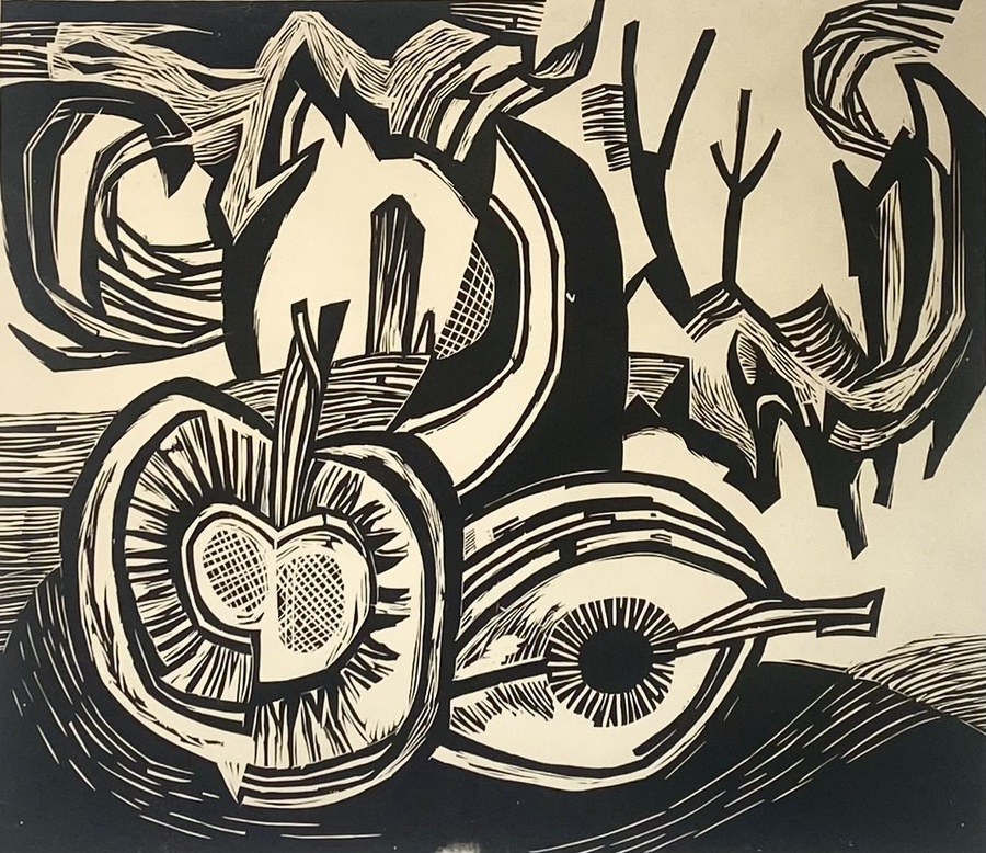 Houtsnede door Hubert Levigne (1905–1989), uitgevoerd in zwart op crème papier. De voorstelling toont een modernistisch stilleven in expressieve lijnvoering, tegen een abstracte achtergrond met golvende vormen. Gesigneerd in potlood rechtsonder “H. Levigne”. Nederlands werk uit de tweede helft van de 20e eeuw.