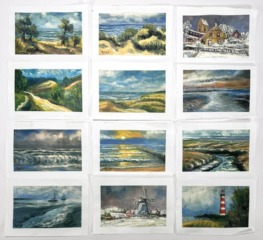 Twaalf miniaturen in aquarel op papier, gesigneerd met het monogram "Eg. de G." en daterend uit circa 1960–1980. De werken zijn uitgevoerd in realistische stijl en tonen Nederlandse kust- en polderlandschappen (duinen, vuurtoren, molen).
