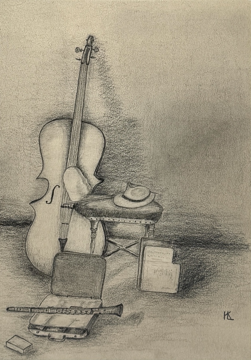 Tekening in potlood/houtskool op papier met een realistisch stilleven van muziekinstrumenten, uitgevoerd in een academische stijl. Het werk toont een grote cello, een klarinet in een open kist en een hoed op een kruk. Het werk dateert uit circa 1920–1950 en is rechtsonder gesigneerd met monogram KL.