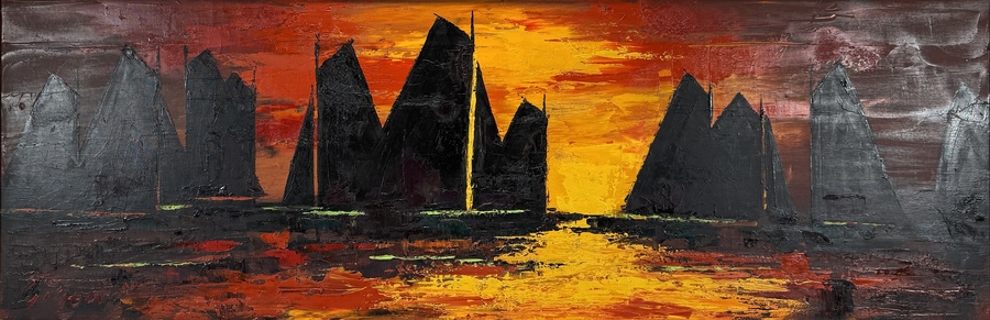 Olieverfschilderij op doek met een maritiem tafereel, onduidelijk gesigneerd linksonder en daterend uit circa 1960–1980. Het werk is uitgevoerd in een expressief realistische stijl met impasto en toont silhouetten van zeilschepen tegen een zonsondergang in rood, oranje en zwart.
