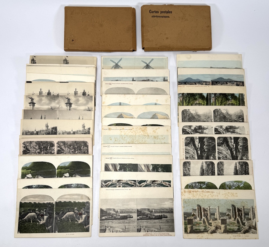 Collectie van circa 40 historische stereofoto's , daterend uit de periode circa 1900–1915. De kaarten zijn op karton door de Duitse uitgever A. Schroll & Söhne in München. Ze tonen diverse topografische scènes (molens, stadsgezichten, ruïnes) en zijn deels handmatig ingekleurd. Deze fotografische platen worden geleverd in twee originele doosjes.