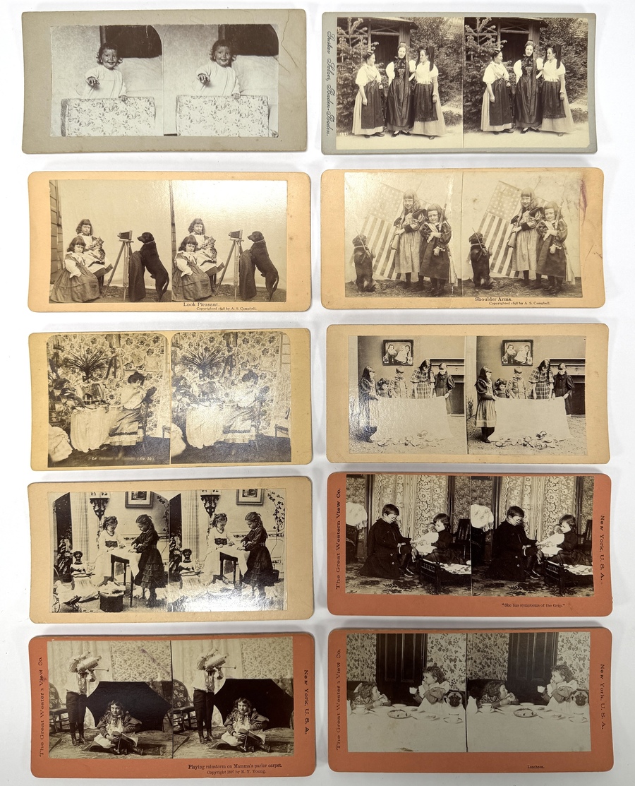 Tien stereofoto's op diverse kartonnen dragers (geel, rood), daterend uit circa 1890–1905. De fotografische afdrukken zijn uitgegeven door Amerikaanse bedrijven als H.C. White Co. en T.V. Smillie en tonen genrescènes van kinderen en dieren in theatraal geposeerde interieurs. De collectie omvat scènes van huiselijke humor en de Amerikaanse huishoudcultuur uit die periode.