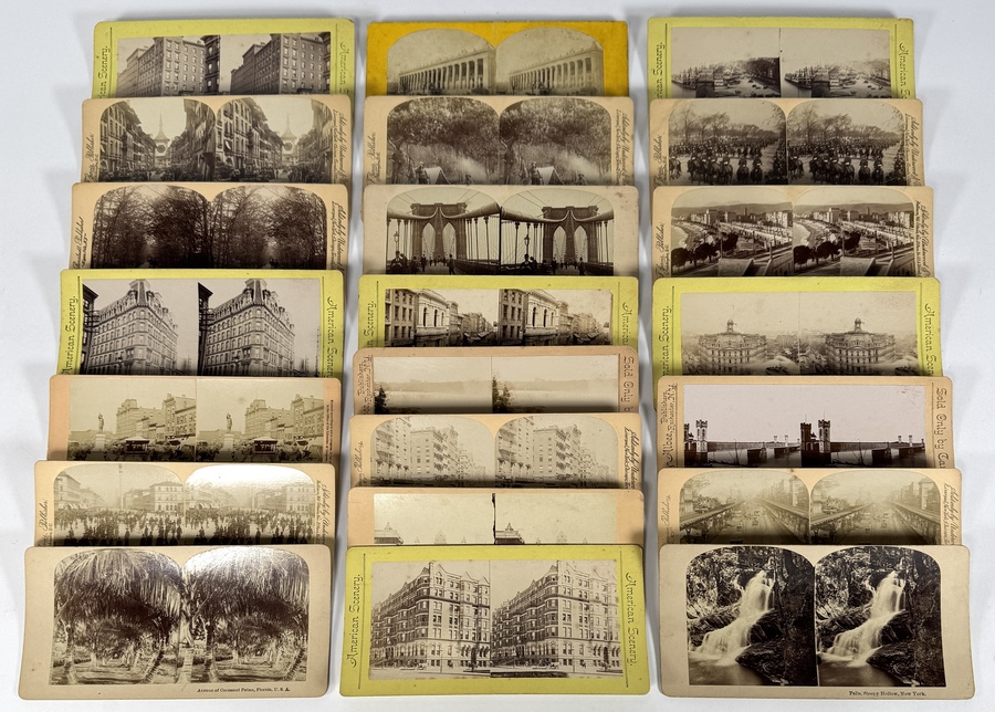 Collectie van ongeveer 21 historische stereofoto's van de Amerikaanse uitgever B.W. Kilburn en andere firma's, daterend uit de periode circa 1890–1910. De beelden zijn chemische afdrukken op kartonnen kaarten en tonen topografische registraties van Amerikaanse stadsgezichten en Europese scènes.