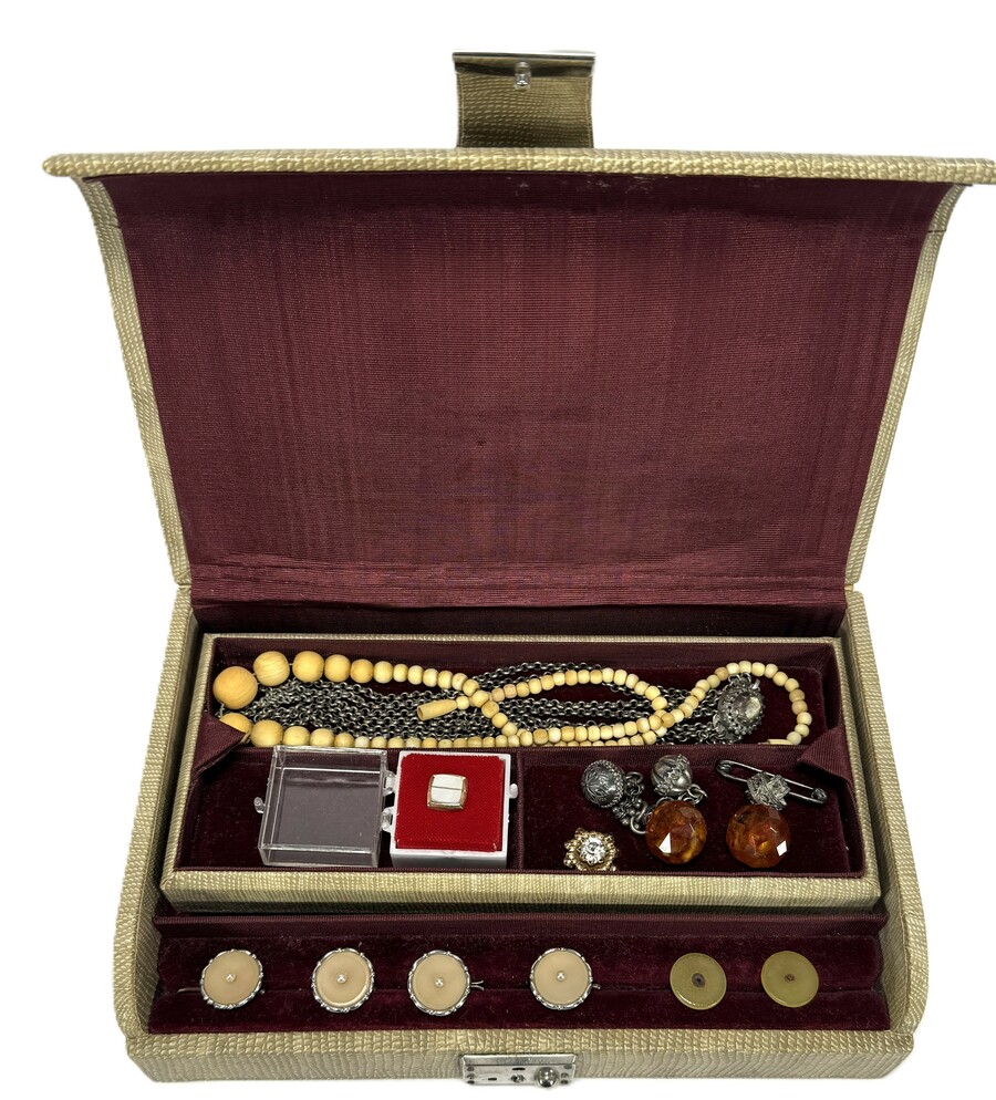 Rechthoekige juwelendoos uit de tweede helft 20e eeuw, bekleed met gestructureerd textiel en gevoerd met fluweel. De doos bevat een eclectische collectie van diverse vintage sieraden en accessoire waaronder een houten ketting en manchetknopen.