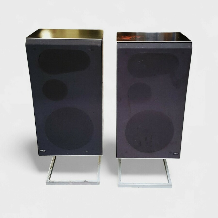 Een paar luidsprekers model Beovox S75 van de Deense fabrikant Bang & Olufsen), geproduceerd in de periode 1976–1980. De luidsprekers zijn uitgevoerd in hout en metaal en vertegenwoordigen het Scandinavische functionalisme van die tijd.
