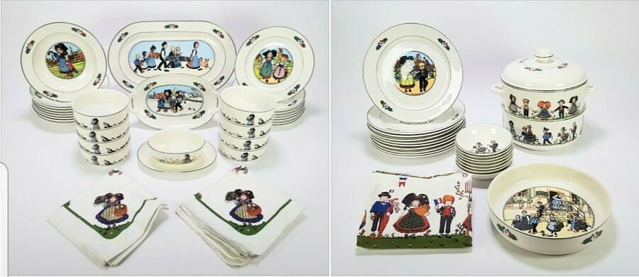 Porseleinen servies met bijbehorend textiel van de fabrikant Villeroy & Boch. Het servies modelnaam "Hansi d'Alsace" dateert uit eind 20e eeuw en is gemerkt. Het decor is aangebracht middels transferdruk en toont cartooneske figuren in klederdracht in verschillende scènes.