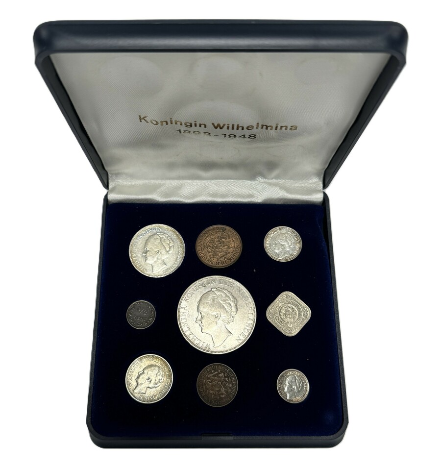 Nederlandse munten van Koningin Wilhelmina (1890–1948). De collectie bestaat uit verschillende denominaties in zilver (rijksdaalder/gulden) en brons/nikkel (centen/dubbeltjes). De munten zijn geslagen door de 's Rijks Munt en tonen de verschillende koninklijke portretten. De set wordt gepresenteerd in een herdenkingsdoosje uit circa 1970–1990.
