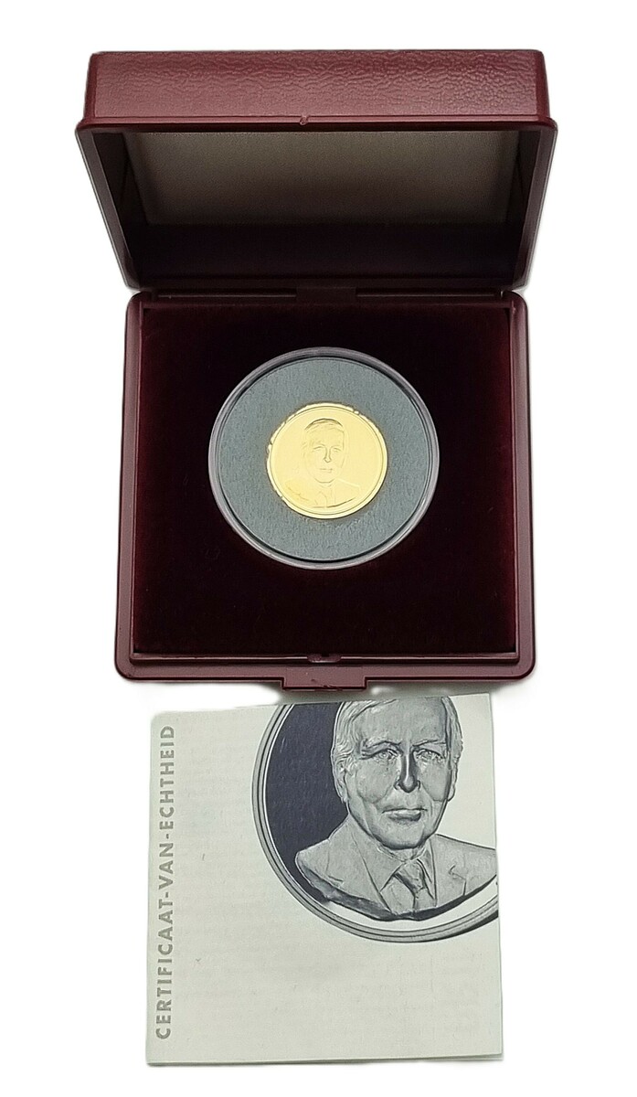 Gouden herdenkingspenning 21,6 karaat, uitgegeven in 2002, H.K.H. Prins Claus der Nederlanden (1926–2002). De herdenkingspenning is in proof-kwaliteit, met een portret van de Prins op de voorzijde en een symbolische weergave van een wereldbol met duiven op de keerzijde. De penning is van Nederlandse herkomst wordt geleverd in de originele cassette met Certificaat van Echtheid.