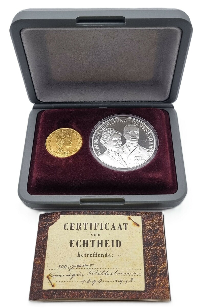 Nederlands gouden tientje uit 1912, geslagen in 900/1000 goud, gecombineerd met een moderne herdenkingspenning uit zilver (925/1000), in originele presentatiecassette met Certificaat van Echtheid. Het gouden tientje, ontworpen door J.C. Wienecke (1872–1951), toont Koningin Wilhelmina met hermelijnen mantel en het Rijkswapen. De zilveren penning, eind 20e eeuw, beeldt Wilhelmina en Prins Hendrik af, keerzijde de gouden koets.