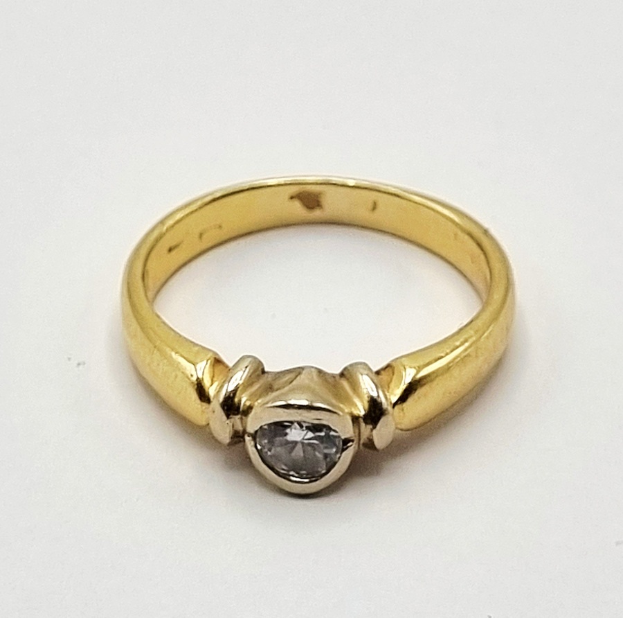 Gouden ring van 14 karaat (585/1000) met een enkele zirkonia, daterend eind 20e eeuw. De ring is uitgevoerd in modernistische stijl met een strakke band en sculpturale schouders. De zirkonia is horizontaal gezet in een bezelzetting. De ring is getoetst op 14 karaat goud.