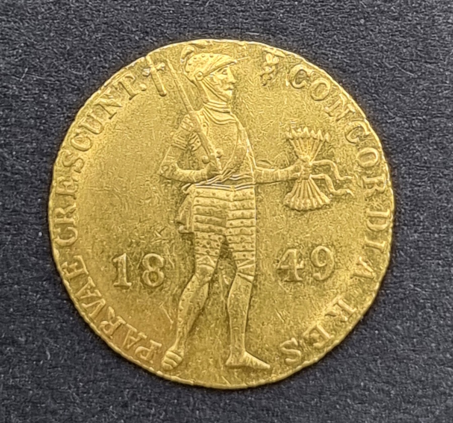 Gouden dukaat, Moneta Aurea Regni Belgii, geslagen in 1849 in Nederland tijdens de regeerperiode van Koning Willem III. De munt van 983/1000 goud toont de traditionele staande ridder en het devies "CONCORDIA RES PARVAE CRESCUNT". De keerzijde bevat de Latijnse legende met bloemornamenten in barokstijl.