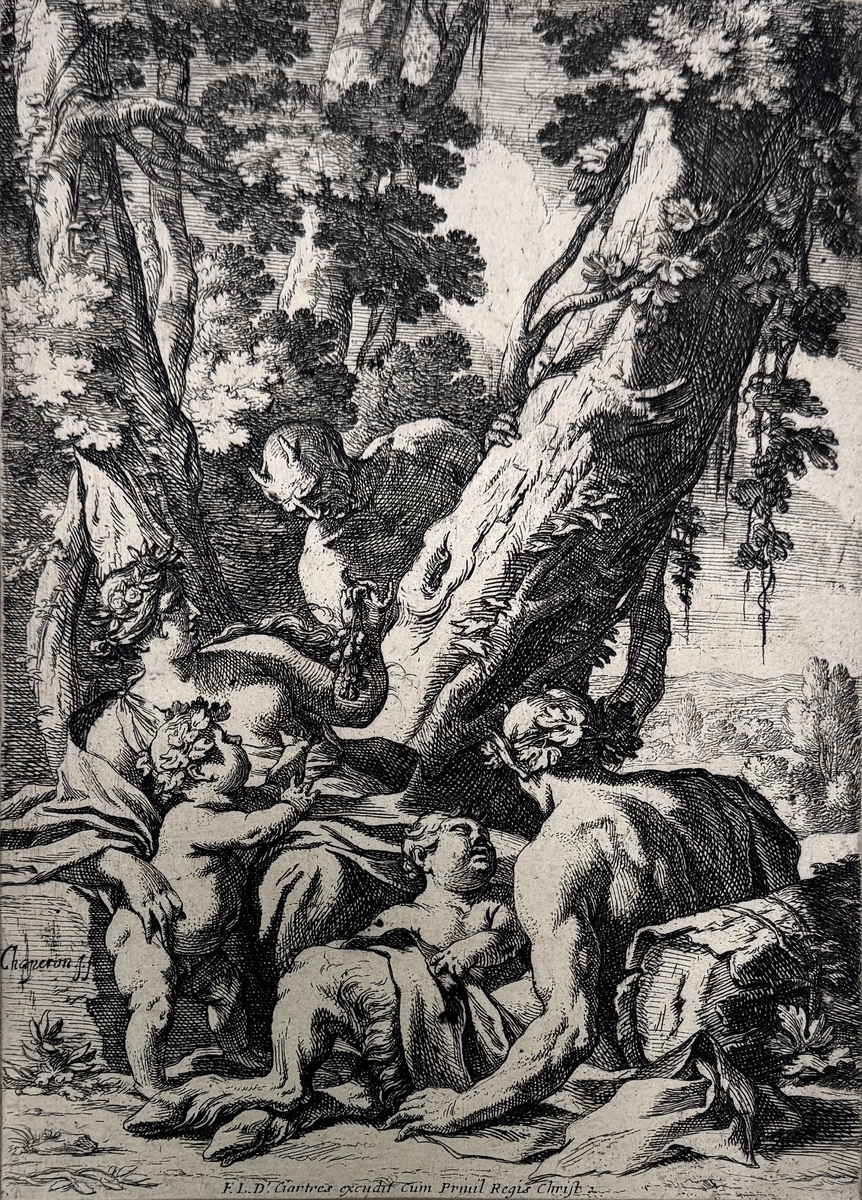 Gravure op papier door Nicolas Chaperon (1612–1656), uitgegeven door François Langlois dit Chartres (1588–1647), ca. 1642–1647. De Franse gravure toont een allegorische scène met naakte figuren in een boslandschap. Het werk is gesigneerd met "Chaperon f." in de plaat.