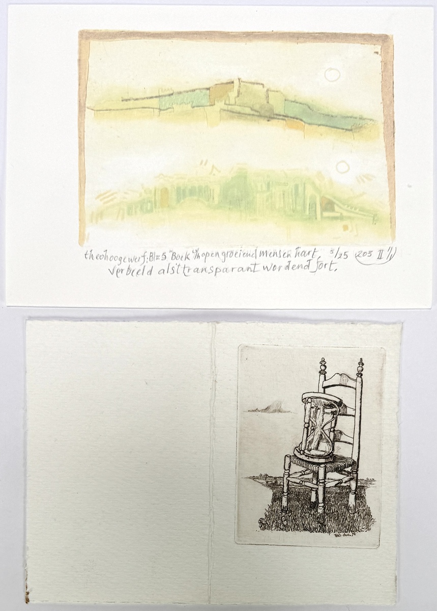 Twee nieuwjaarskaarten, etsen op papier door Theo Hoogewerf (1944), daterend uit de jaren 1972 en 2014. Een ets toont een surrealistische voorstelling van een stoel met zandloper in een landschap. Kleurenets is lyrisch-expressionistisch en genummerd (5/25) als pagina uit het project "open groeiend mensen hart". De kaarten zijn voorzien van persoonlijke boodschappen.
