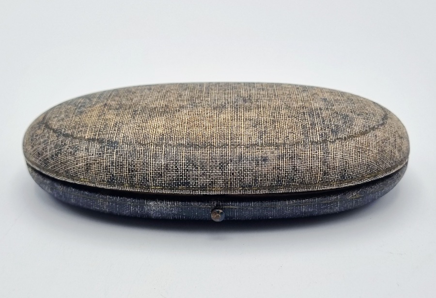 Ovale foedraal met naaigerei uit de eerste kwart 20e eeuw, Europa, bekleed met gespikkeld textiel en gevoerd met satijn. De set is een mariage en bevat een sierlijke zilveren schaarheft gemerkt 835/1000, met stalen snijbladen, en een zilveren vingerhoed gemerkt 925/1000.