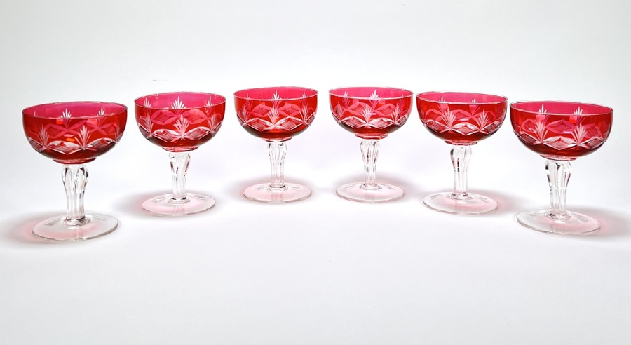 Zes kristallen wijnglazen met heldere stam, vervaardigd in de Bohemen tijdens de eerste helft 20e eeuw. De kelken zijn rood geverfd en vervolgens handgeslepen in stervormige en waaiermotieven.