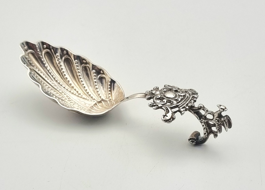Antieke zilveren roomlepel of zwanenhalslepel, uitgevoerd in de rococo stijl uit de 18e eeuw. De lepel dateert circa 1740, toegeschreven aan de Friese zilversmid Pibo Elgersma I (1705–1782) uit Leeuwarden, gemerkt meesterteken PE. De diepe schelpvormige bak met reliëf en puntlijnen langs de radiale ribbels is kenmerkend. De gebogen zwanenhals steel is afgewerkt met een gegoten en geciseleerd rocaille ornament.