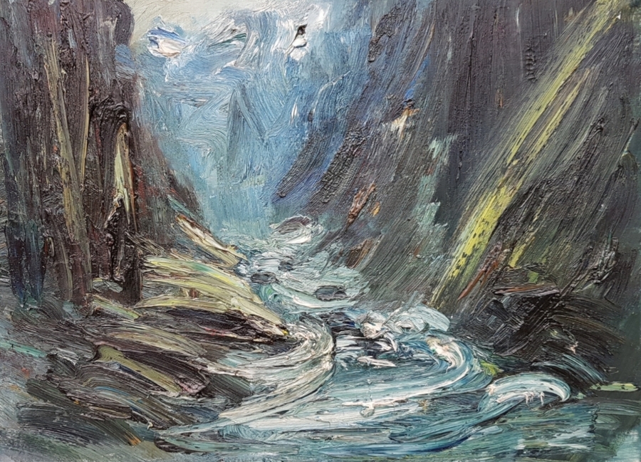 Olieverf op doek in expressionistische stijl, toegeschreven aan de Nederlandse schilder Henri Kley (1903–1977). Dit landschap uit midden 20e eeuw toont een woest stromend water in een ravijn, de schildering kenmerkt zich door impasto.