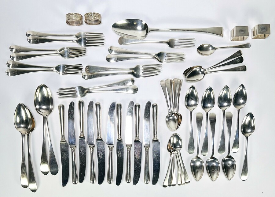 Een omvangrijk lot zilver bestek en servetringen, bestaande circa zevenenvijftig delen uit midden 20e eeuw, voornamelijk uit het Verenigd Koninkrijk. Het merendeel van het bestek is tweede gehalte zilver (835/1000) met diverse zilverkeurmerken, vervaardigd door stansen en walsen in een klassieke stijl met initialen. Het lot bevat onder andere dertien vorken, vierentwintig lepels, elf messen met stalen lemmet en vier servetringen.
