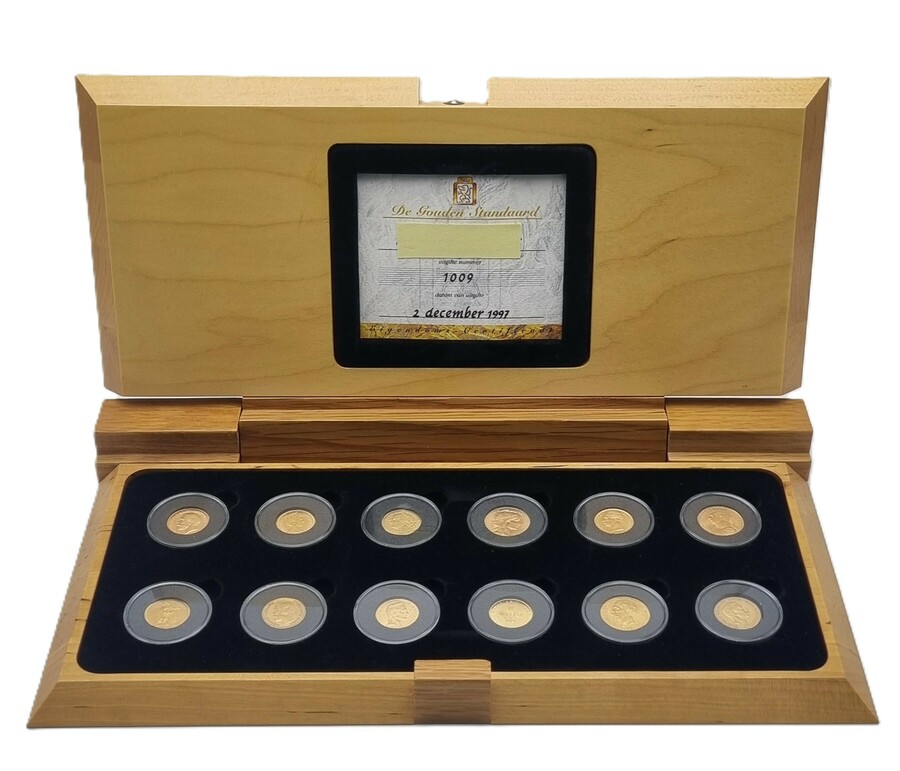 Cassette met twaalf gouden munten uit de serie "De Gouden Standaard", uitgifte nr. 1009, 2 december 1997. Het lot herdenkt historische Europese munten en wordt gepresenteerd in een houten presentatiekist met blauw velours interieur met een map met gedrukte documentatie.