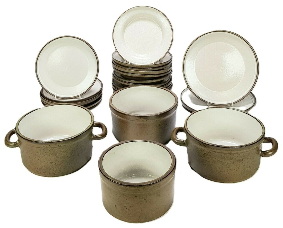 Mid-century modern aardewerk servies met een rustieke esthetiek, daterend uit circa 1965–1975, West-Europa. De set bestaat uit schalen met handgrepen en diverse borden, uitgevoerd in steengoed met tweekleurige gespikkelde glazuren. De buitenkant is mat bruingrijs, terwijl de binnenzijde glanzend wit is. Een monogram op de onderzijde van het servies.