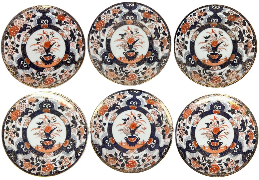 Zes porseleinen Imari borden uit Japan, vervaardigd in de Arita-regio voor de exportmarkt. De borden dateren uit de midden 20e eeuw met decoratie in onderglazuur blauw en overglazuur rood. De centrale bloemenvaas en de randen zijn traditioneel versierd.