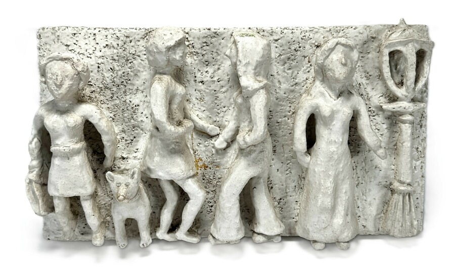 Keramiek reliëf paneel in expressionistische stijl, met een grof gemodelleerde voorstelling van vier gestileerde figuren met hond en lantaarn. Het aardewerk is handgevormd en afgewerkt met een ruwe, gespikkelde witte glazuur. Het paneel is bedoeld als gevelversiering en dateert uit de Mid-century modern periode, ca. 1950–1970.