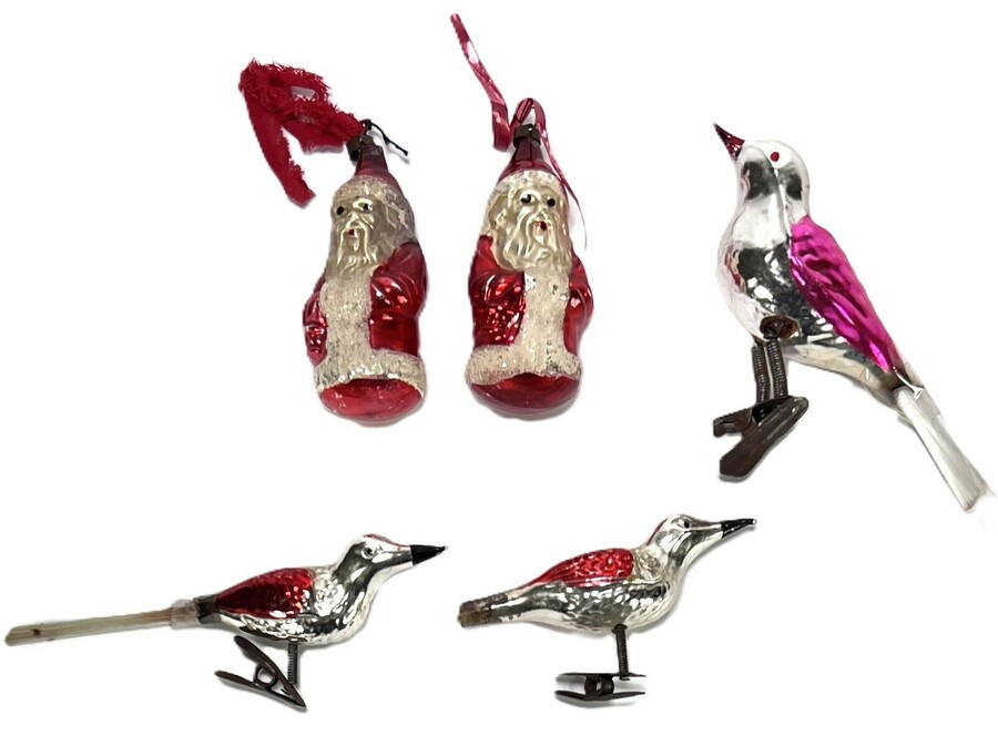 Lot kerstversiering bestaande uit vijf mondgeblazen glazen ornamenten uit de midden 20e eeuw, Oost-Europa. De kerstversiering is handbeschilderd, met een felle kleurenselectie en bestaat uit twee kerstmannen met glittersneeuw en drie vogelornamenten, twee met staart, en metalen clips voor de kerstboom.