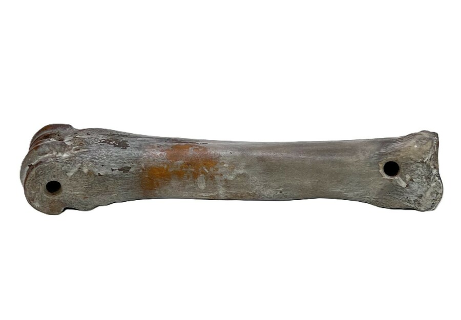 Oud schaats vervaardigd uit een bewerkt runder-middenvoetsbeen, daterend uit de circa 1400–1750, Noordwest-Europa. De schaats heeft twee geboorde gaten aan de uiteinden voor de bevestigingsriemen en diende als glij-instrument over ijs.