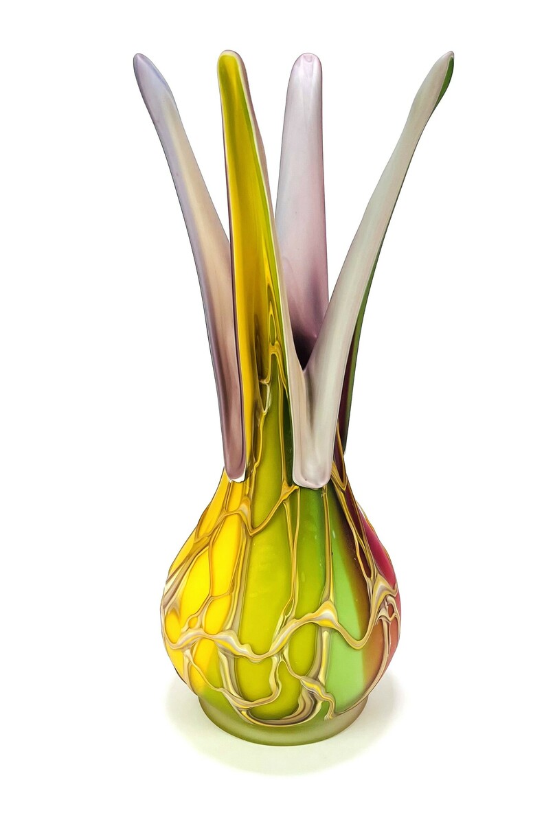 Deze mondgeblazen Goldan Talast vaas is vervaardigd in een meerkleurige gelaagde techniek. De vaas heeft een bolle buik met een decoratie van witgele glasdraden en een asymmetrische, vierlobbige hals in pastelkleuren. De vaas is van Noorse herkomst en dateert uit ca. 1980–2000. Gemerkt aan de onderkant.