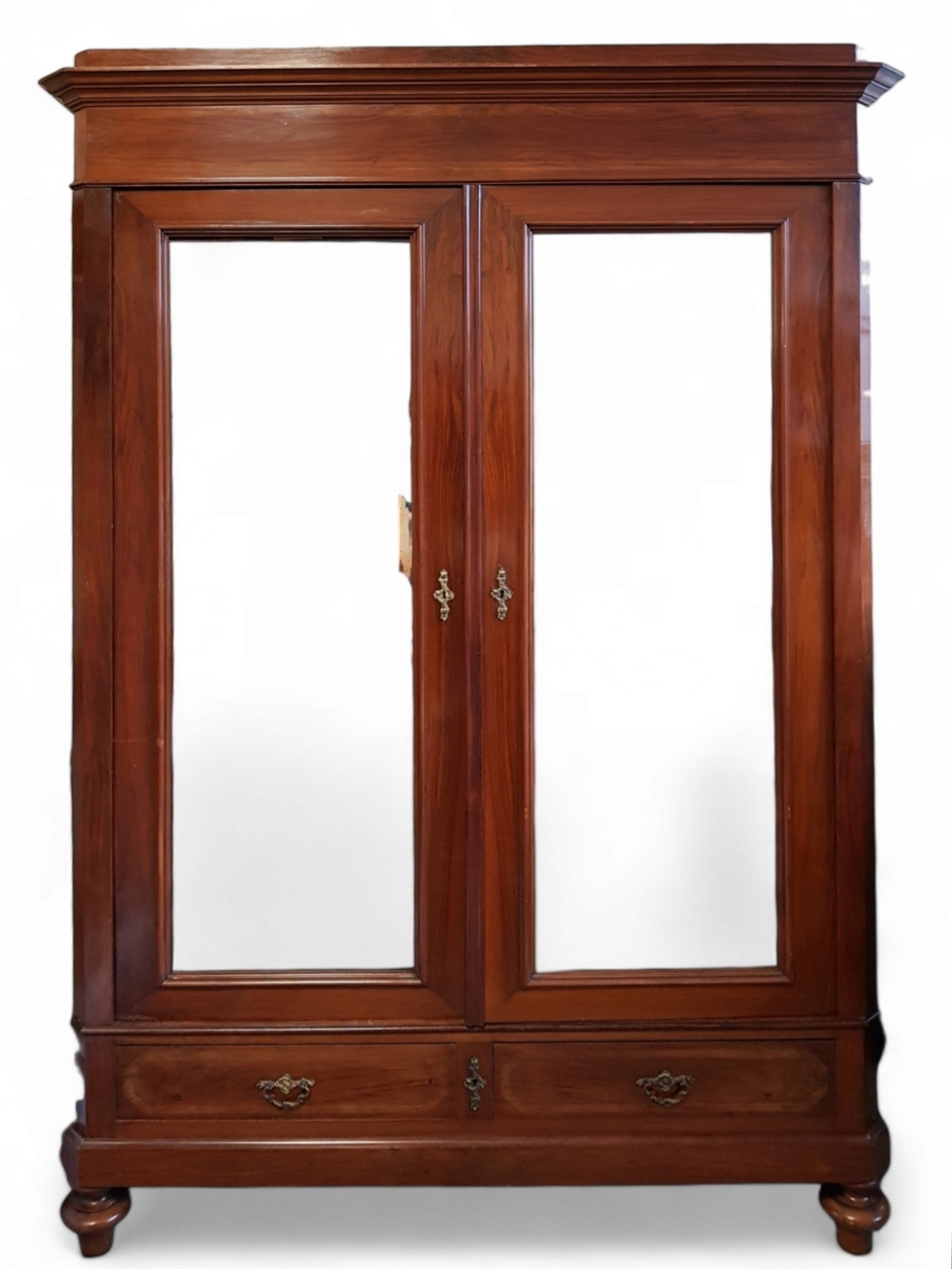 Tweedeurs Biedermeier spiegelkast, vervaardigd van notenhoutfineer en spiegelglas, daterend uit circa 1850–1900. De kast is geconstrueerd door middel van schrijnwerk en is voorzien van een overstekende kroonlijst en twee spiegeldeuren boven twee lades. Het meubel staat op gedraaide bolpoten en bevat geornamenteerd messing beslag.