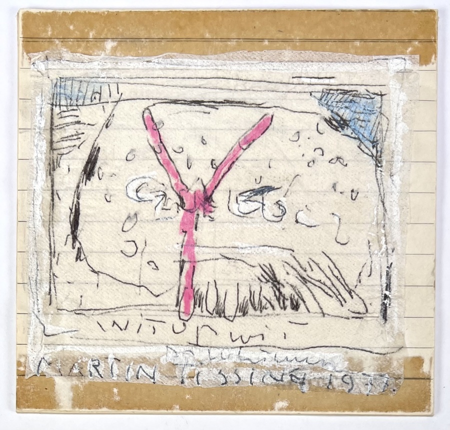 Gemengde techniek met pen en waskrijt op een servet en schriftje, getiteld "czułość", uitgevoerd door de Nederlandse kunstenaar Martin Tissing (1945). Het werk uit 1977, in een neo-expressionistische stijl, toont een geabstraheerde, felroze figuur op een ovale ondergrond.