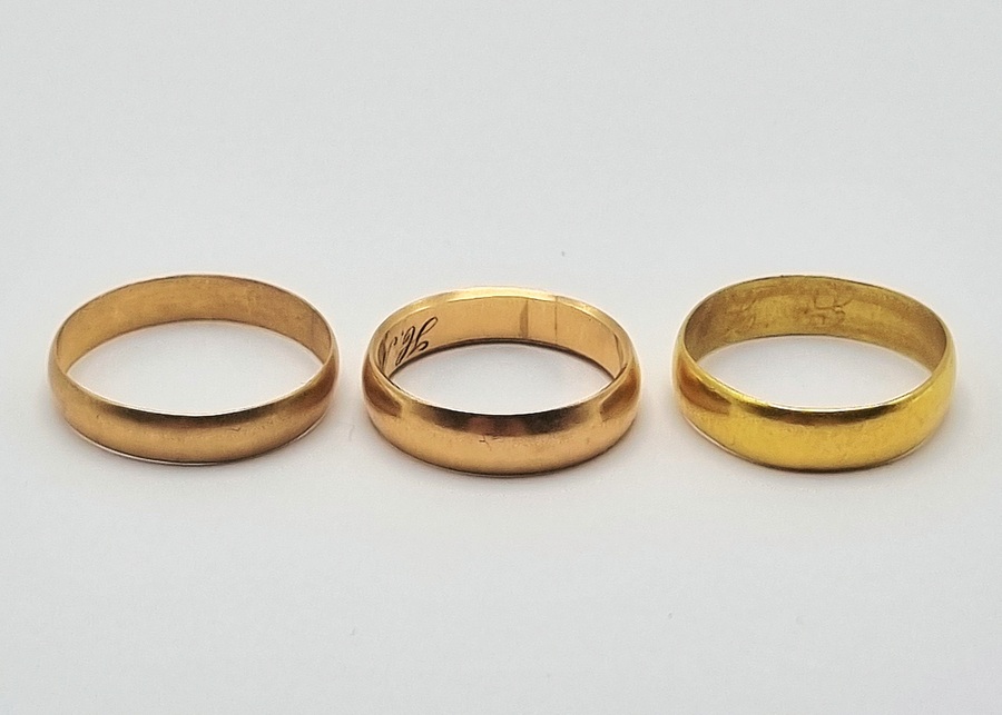 Drie gouden trouwringen in de klassieke minimalistische stijl, daterend uit de tweede helft van de 20e eeuw uit Europa. De trouwringen variëren in tint van helder geelgoud tot subtiel roségoud en zijn gepolijst.