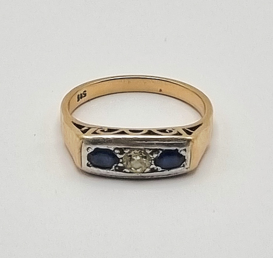 14 karaat geelgouden ring met een rechthoekig stenenpaneel, gemerkt 585. Het sieraad is uitgevoerd in de Mid-century modern stijl en wordt gedateerd midden 20e eeuw. Het bovenvlak bevat een centrale diamant en twee ovale saffieren in een combinatie van kraal- en kastzetting. De schouders tonen opengewerkte filigraan decoratie.