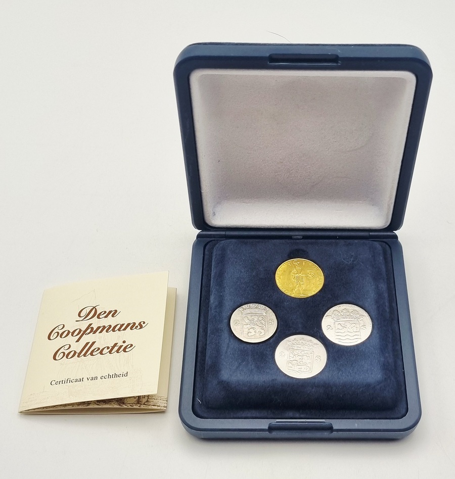 Numismatische set “Den Coopmans Collectie”, uit 1996, bevat vier originele munten van Nederlandse afkomst. De set bevat een gouden dukaat, geslagen tussen 1921–1928 in 983/1000 goud en drie Dubbele Wapenstuivers. De dukaat en originele zilveren munten uit de 18e eeuw van Holland, Zeeland en West-Friesland worden geleverd in een box met certificaat van echtheid.