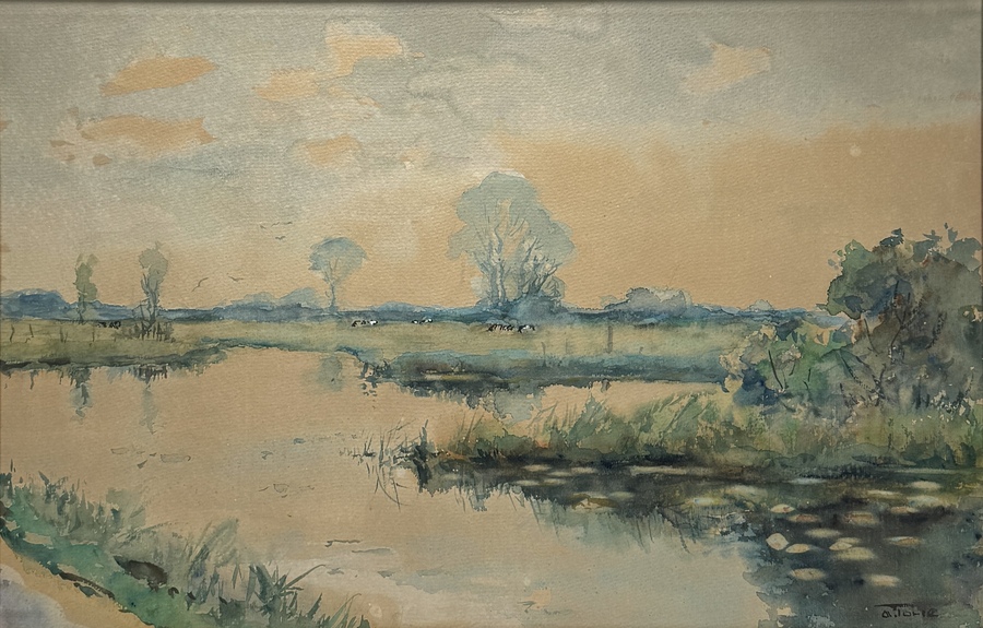 Aquarel op papier door de Nederlandse kunstenaar Albert Torie (1896–1969). Het werk is in impressionistische stijl uitgevoerd en toont een rustig polderlandschap met een waterpartij in de voorgrond, verspreide bomen, vee in de verte en een zacht gekleurde lucht. De aquarel is rechtsonder gesigneerd "A. Torie" en dateert uit de midden 20e eeuw.