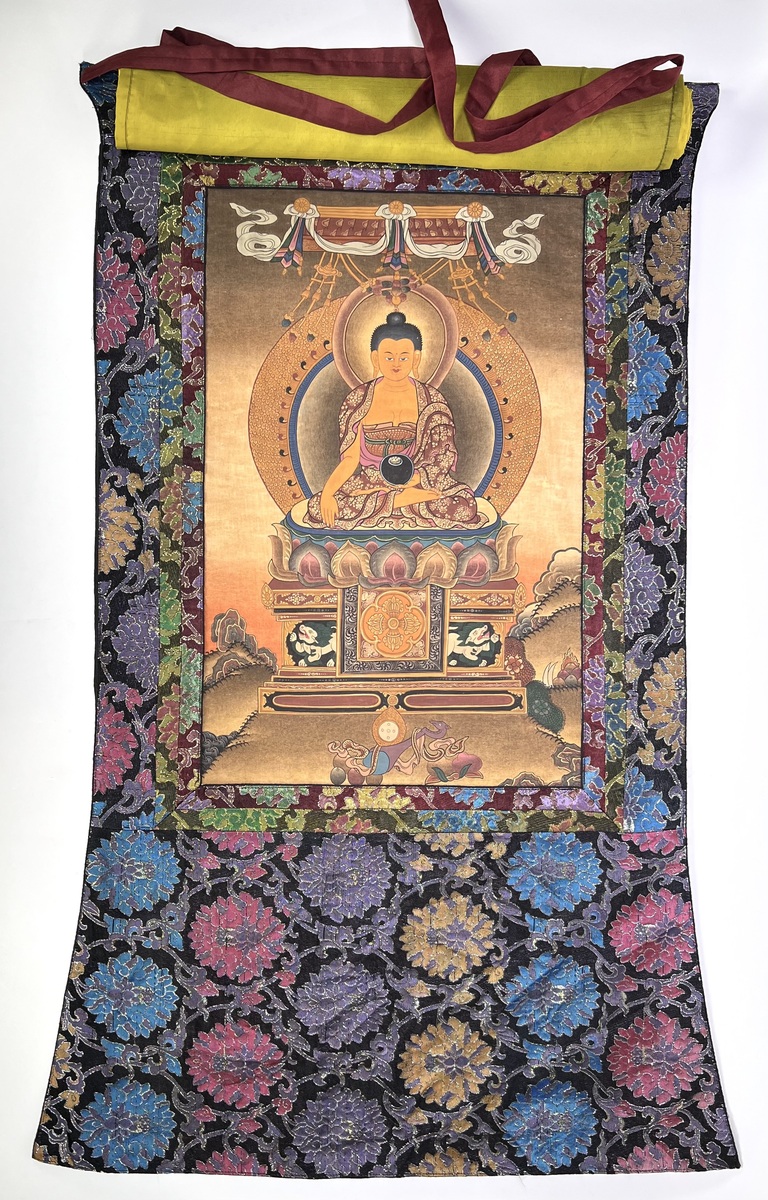 Tibetaans boeddhistische thangka (rolschildering) uitgevoerd in de Tibetaanse traditie, daterend uit de tweede helft van de 20e eeuw. De schildering is gemaakt met minerale pigmenten op papier en toont een zittende Bhaiṣajyaguru, de medicijn Boeddha. Het werk is omgeven door een weelderige montage van zijdebrokaat, kenmerkend voor de Himalaya regio.