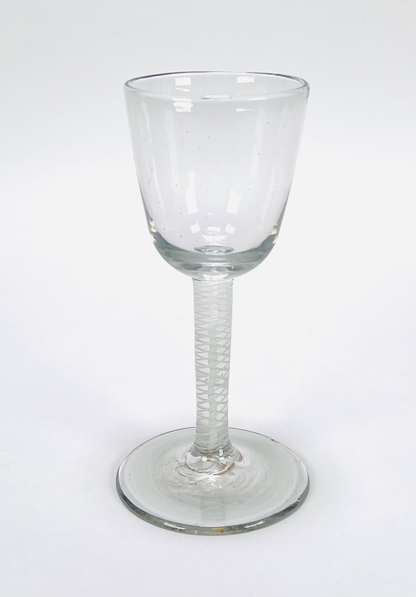 Slingerglas, 18e eeuw, met spiraalvormige luchtinsluiting en witte latticino-decoratie in de holle stam, vervaardigd uit helder mondgeblazen glas met tulpvormige kelk en ronde schijfvoet. Datering circa 1750–1780, Engeland. Het glas toont de kenmerkende air-twist-techniek van rococo-glasblazerijen en werd ambachtelijk gevormd met zichtbaar pontil aan de onderzijde, typerend voor vroeg handgemaakt tafelglas uit deze periode.