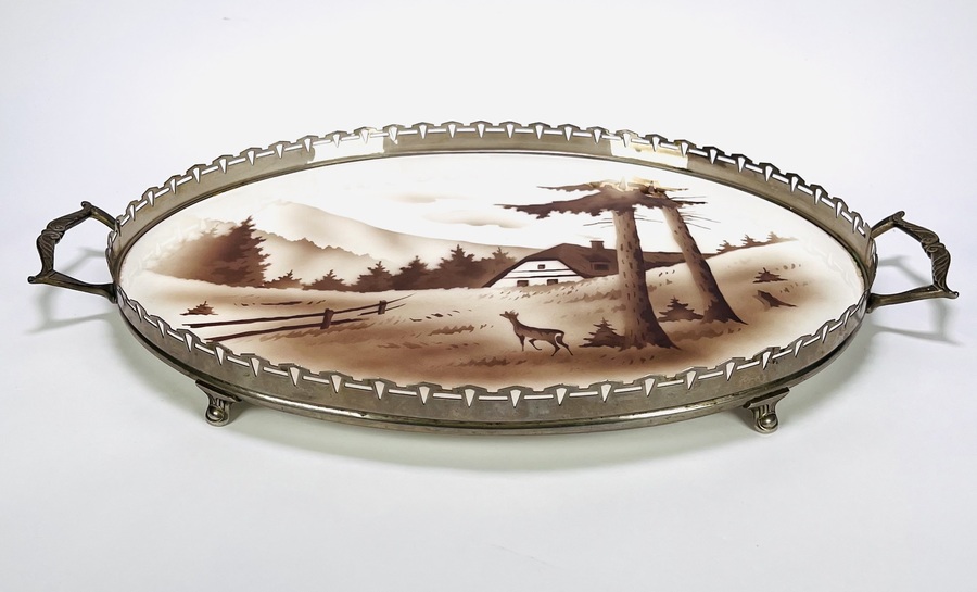Art Deco ovaal dienblad uit circa 1920–1940, met een romantische sepiakleurige Alpendecoratie, bestaande uit een aardewerk middenstuk omlijst door vernikkeld metaal met bolpootjes en bewerkte handvatten.