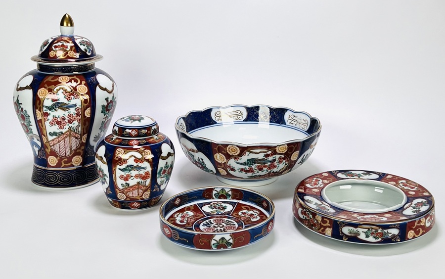 Vijf Imari porseleinen voorwerpen uit de tweede helft van de 20e eeuw. Het porselein uit Japan bestaat uit vazen, een geschulpte kom en schalen. De decoratie is handbeschilderd met onderglazuur blauw en overglazuur rood en goud met vogel en florale motieven.
