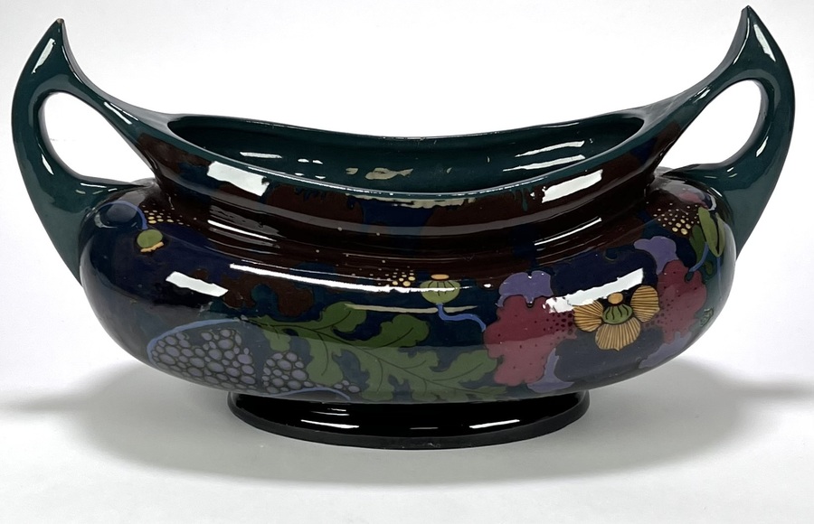 Aardewerk jardinière, uitgevoerd in Gouds plateel, gemerkt aan de onderzijde met de fabrieksaanduiding Ivora Gouda, modelnummer 164 en schildersinitialen. De jardinière uit het eerste kwart 20e eeuw is gedecoreerd met een handbeschilderd floraal motief van druiven en klaprozen. De schaal kenmerkt zich door een diep donker glazuur en sierlijke opstaande oren.