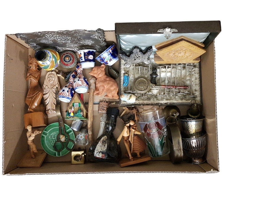 Eclectische lot curiosa met diverse verzamelobjecten uit circa 1950–2000, met een verscheidenheid aan materialen zoals hout, keramiek, glas en diverse metaalsoorten uit verschillende Europese en oosterse streken.
