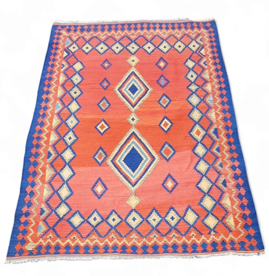 Traditionele kelim, vlakgeweven tapijt uit het Midden-Oosten, daterend uit het midden van de 20e eeuw. Het kleed is gemaakt van wol door middel van de slit-tapestry techniek en kenmerkt zich door een krachtig geometrisch decor in rood-oranje en kobaltblauw, met een centrale ruitvormige medaillon en een brede ruitvormige rand.