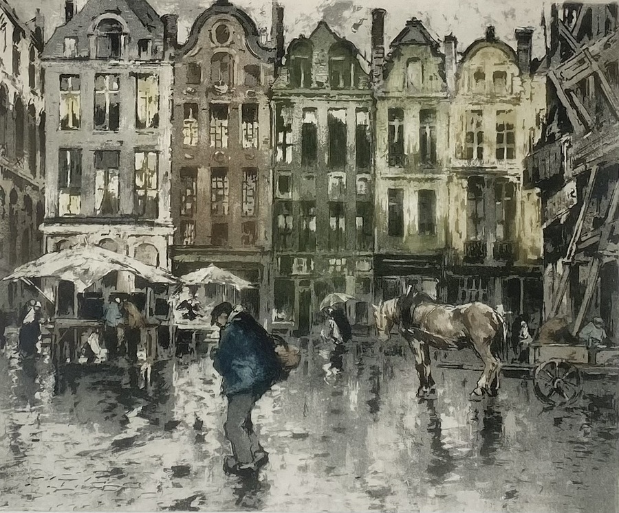 1369. Aquatint, Ferdinand Luigini – regenachtig stadsplein, eerste helft 20e eeuw