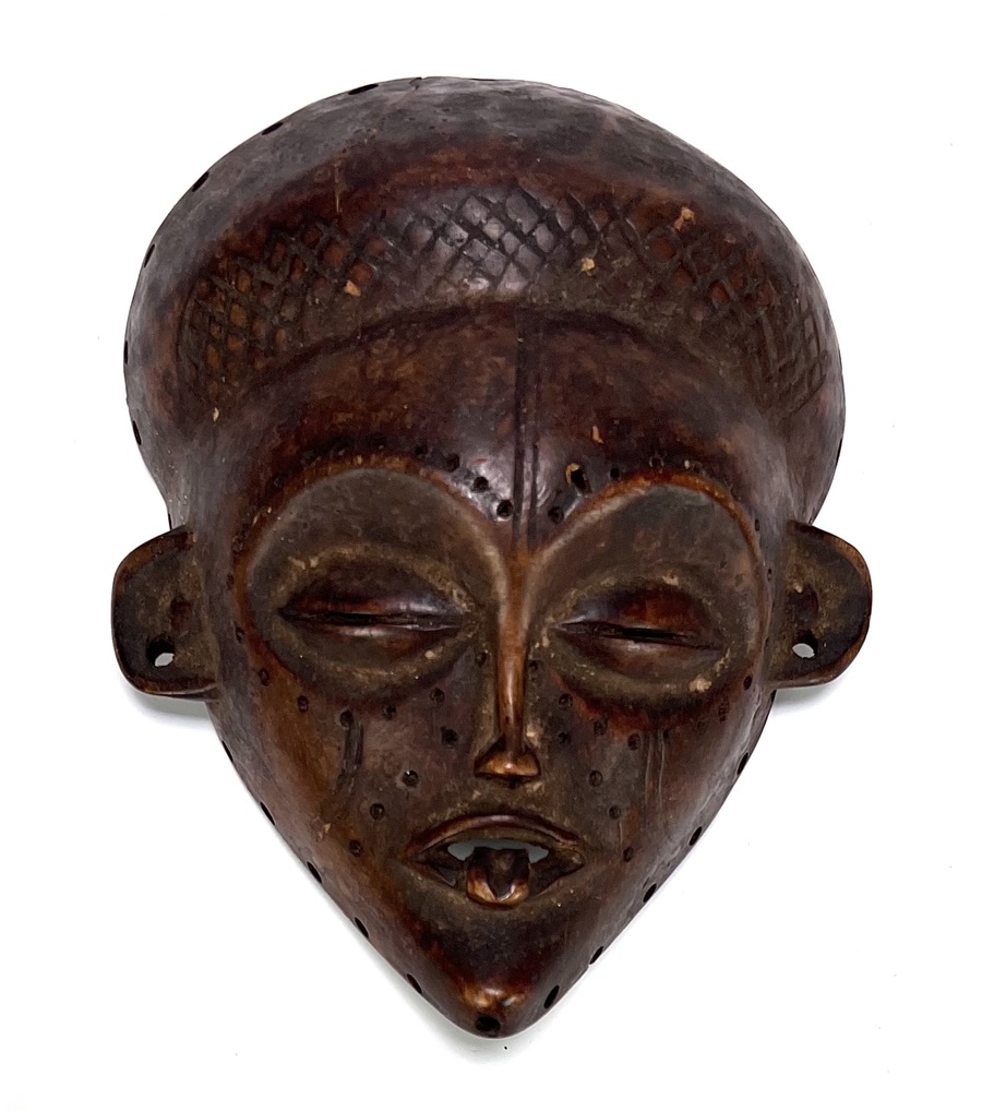 Een Chokwe Pwo wandmasker uit Angola, tweede helft 20e eeuw, vervaardigd van donker gepatineerd hardhout. Het masker toont een gestileerd vrouwelijk gelaat met kenmerkende littekenpatronen (scarificaties) op het voorhoofd en de wangen.
