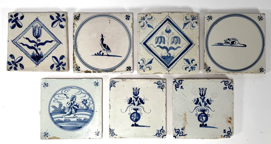 Zeven antieke Delfts blauwe Hollandse wandtegels, uitgevoerd in tinglazuur aardewerk met diverse decors uit de 17e tot 19e eeuw, waaronder bloemvazen met ossekop hoekmotieven, cirkels met dieren en figuren en geometrische ornamenttegels.