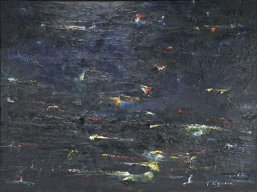 Schilderij door Teun Gijssen (1910–2003), uitgevoerd in olieverf op doek. Het werk toont een abstract expressionistische compositie met dik aangebrachte verflagen in donkere blauw- en zwarttinten, doorbroken door lichte kleuraccenten. Gesigneerd rechtsonder 'T. Gijssen', daterend uit de tweede helft van de 20e eeuw.