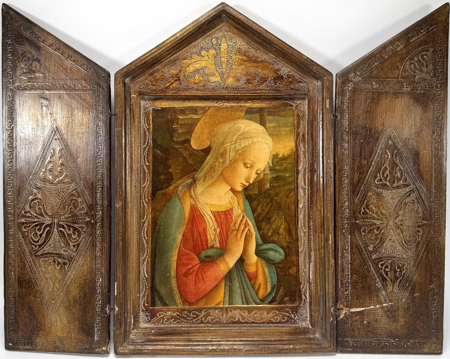 Houten altaar drieluik in Italiaanse renaissancestijl, vervaardigd rond 1900. Het middenpaneel toont een geschilderde Madonna in gebed tegen een landschappelijke achtergrond, uitgevoerd in tempera. De zijluiken en omlijsting zijn rijkelijk gedecoreerd met sgraffito techniek. Dit devotiestuk is een typisch voorbeeld van Florentijns neogotisch vakmanschap uit de late negentiende of vroege twintigste eeuw.