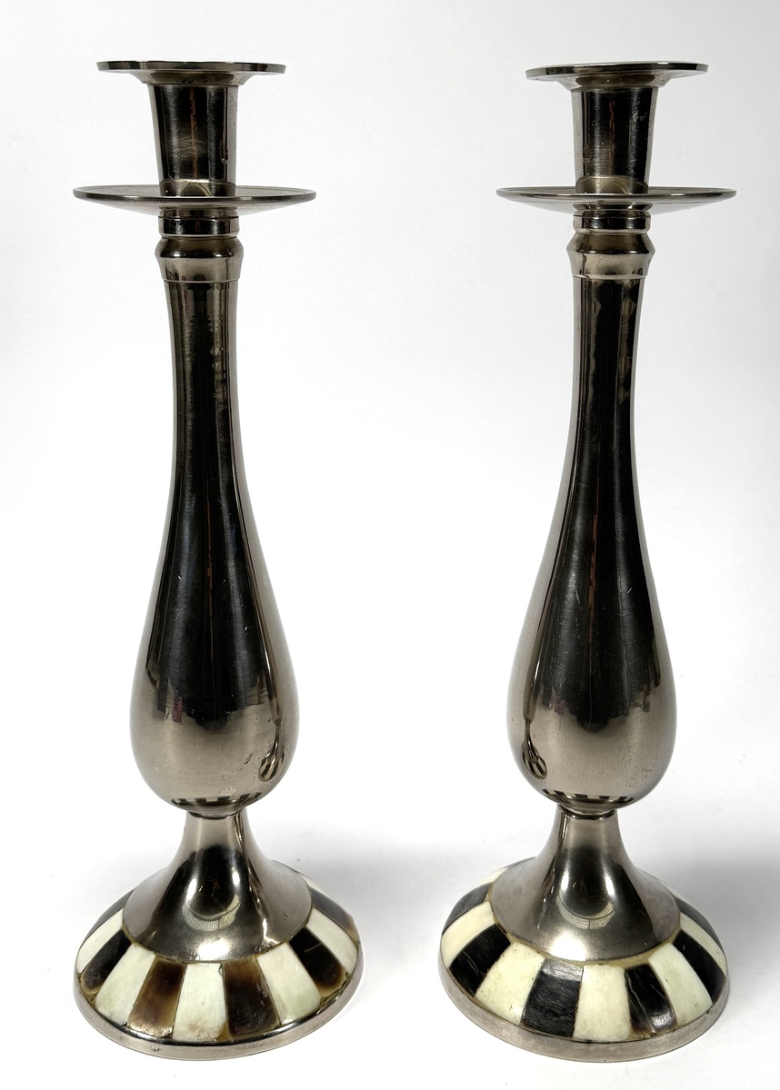 Kandelaren van verzilverd metaal, vervaardigd in de tweede helft van de twintigste eeuw. De slanke, balustervormige stammen rusten op een ronde voet met geometrisch inlegwerk van been en hoorn.